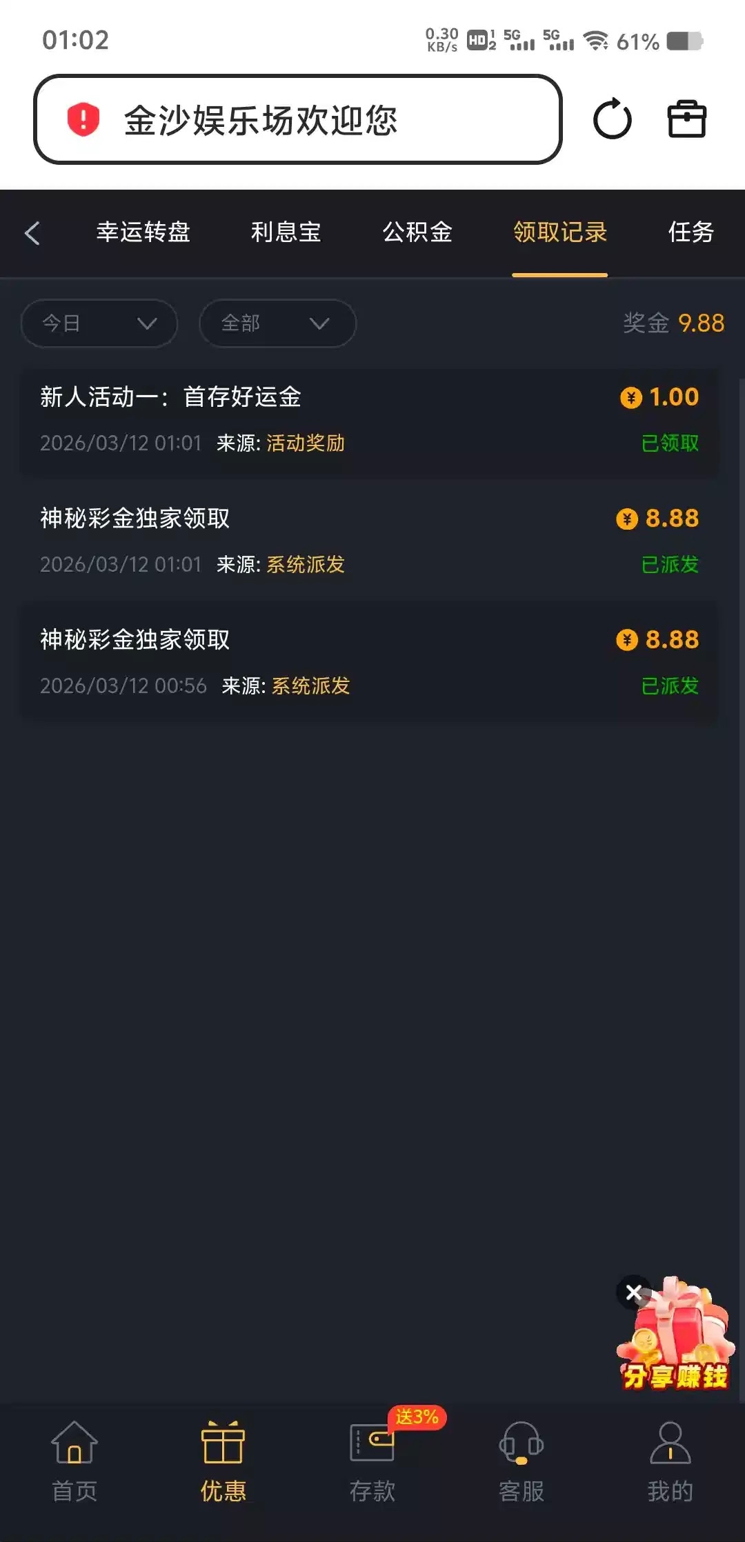 9018回馈8.88,我之前没充值过,领了第一个8.88然后我充了10块又领了一个 9018.com
