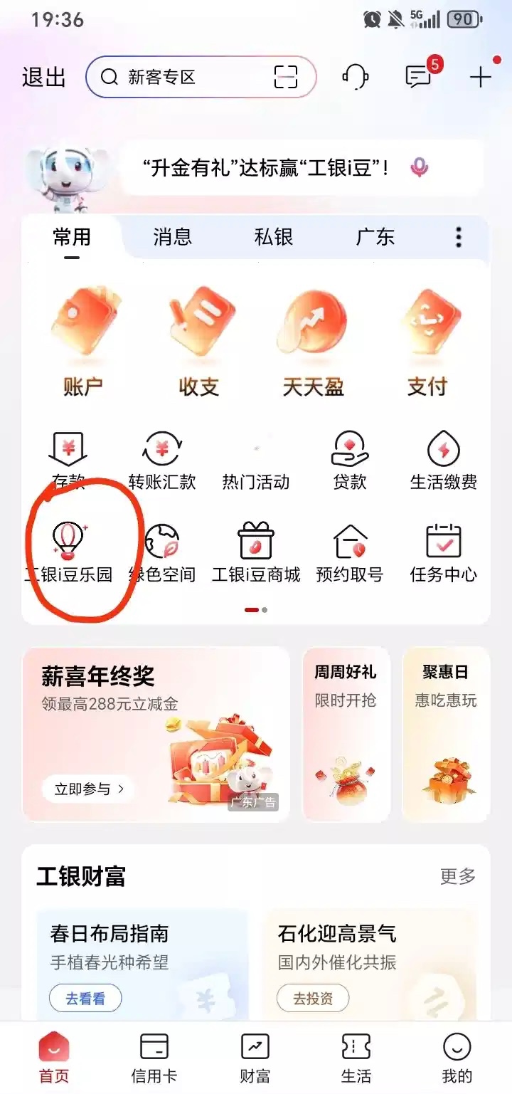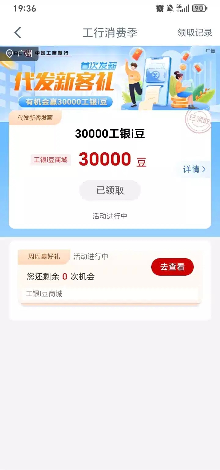 工行app里面的i豆乐园,点周周赢好礼,可以领3万豆,上面显示代发新客领取,但我也没有工行的代发工资的也可以领,没有的话勿喷,3万豆至少领20微信代金券(微信工行微金融兑换)